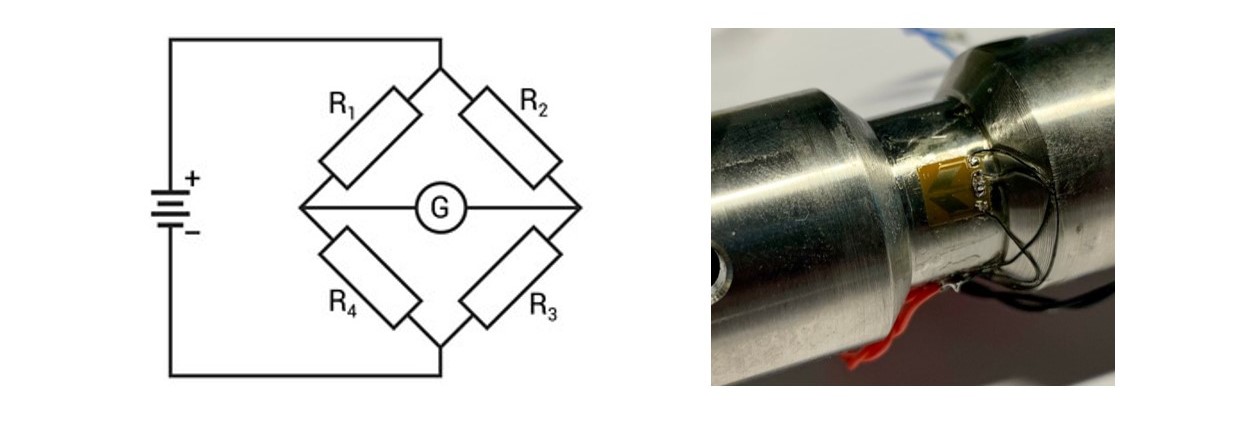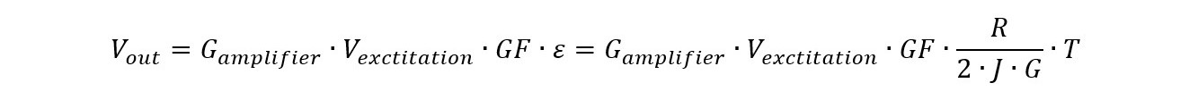 Measuring strain is done with a Wheatstone bridge and the output is proportional to the excitation voltage Vexctitation and the gauge factor GF which is typically 2. Because the output voltage is very small, it is increased by an electronic amplifier Gamplifier.