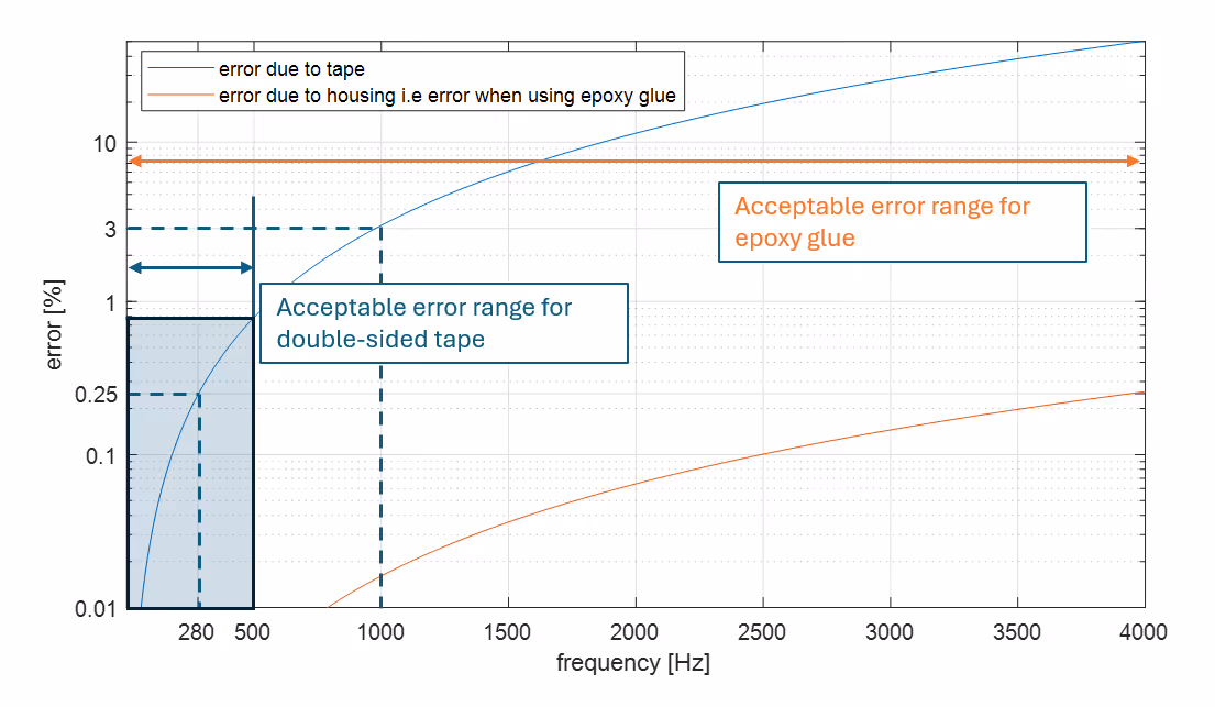 If we were to replace the double-sided tape by an epoxy glue, the stiffness of the intermediate medium would be 10x higher than the stiffness of the housing. In that case, the error of the housing deformation would be representative for the total error. Hence, an epoxy glue attachment covers the full frequency range.