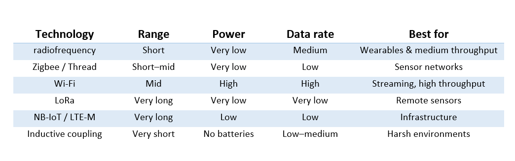 At Forcebit, we use radio-frequency (RF) communication to connect sensors to the gateway. This approach represents our sweet spot, offering a strong balance between low power consumption, sufficient data rate, and practical operating range.